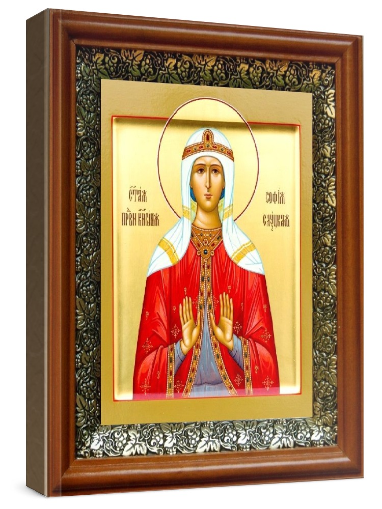 Икона софия слуцкая (19х22), светлый киот. Лик нанесен методом шелкографии на цельную липовую доску, покрытую левкасом (специальным грунтом под живопись). Использованы минеральные (природные) краски. Размер иконы без киота (см): 13х16, с киотом: 19х22. Киот со стеклом, выполнен из березы и украшен басмой (узор из черненой меди в виде виноградной лозы). Икона освящена.
