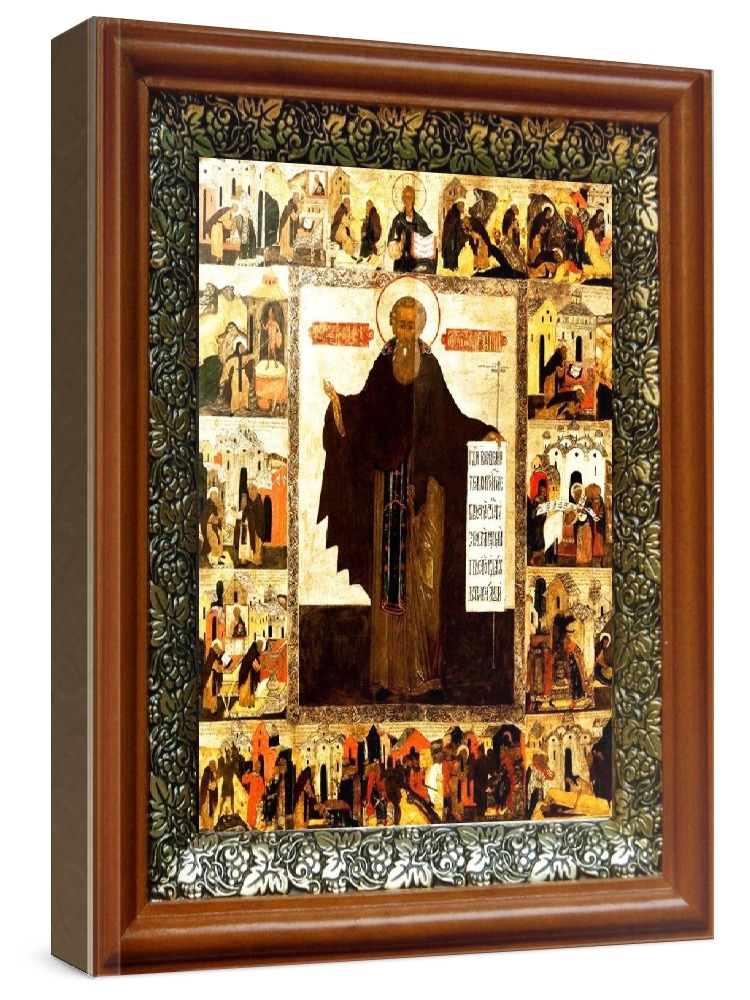 Икона авраамий ростовский (19х22), светлый киот. Лик нанесен методом шелкографии на цельную липовую доску, покрытую левкасом (специальным грунтом под живопись). Использованы минеральные (природные) краски. Размер иконы без киота (см): 13х16, с киотом: 19х22. Киот со стеклом, выполнен из березы и украшен басмой (узор из черненой меди в виде виноградной лозы). Икона освящена.