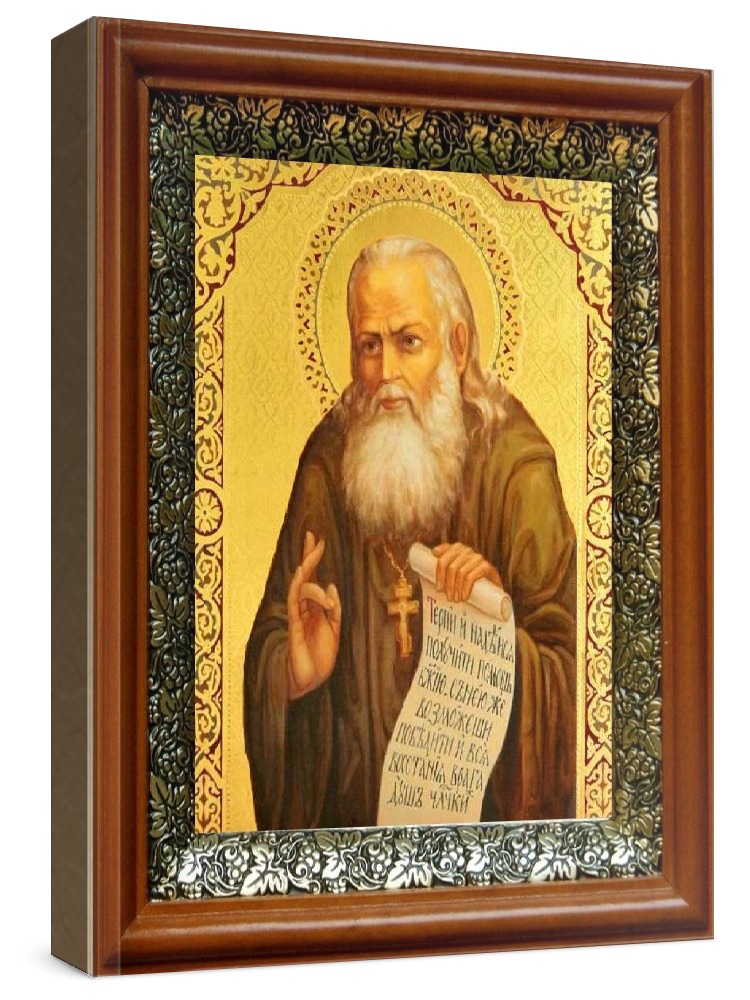 Икона алексий бортсурманский (19х22), светлый киот. Лик нанесен методом шелкографии на цельную липовую доску, покрытую левкасом (специальным грунтом под живопись). Использованы минеральные (природные) краски. Размер иконы без киота (см): 13х16, с киотом: 19х22. Киот со стеклом, выполнен из березы и украшен басмой (узор из черненой меди в виде виноградной лозы). Икона освящена.