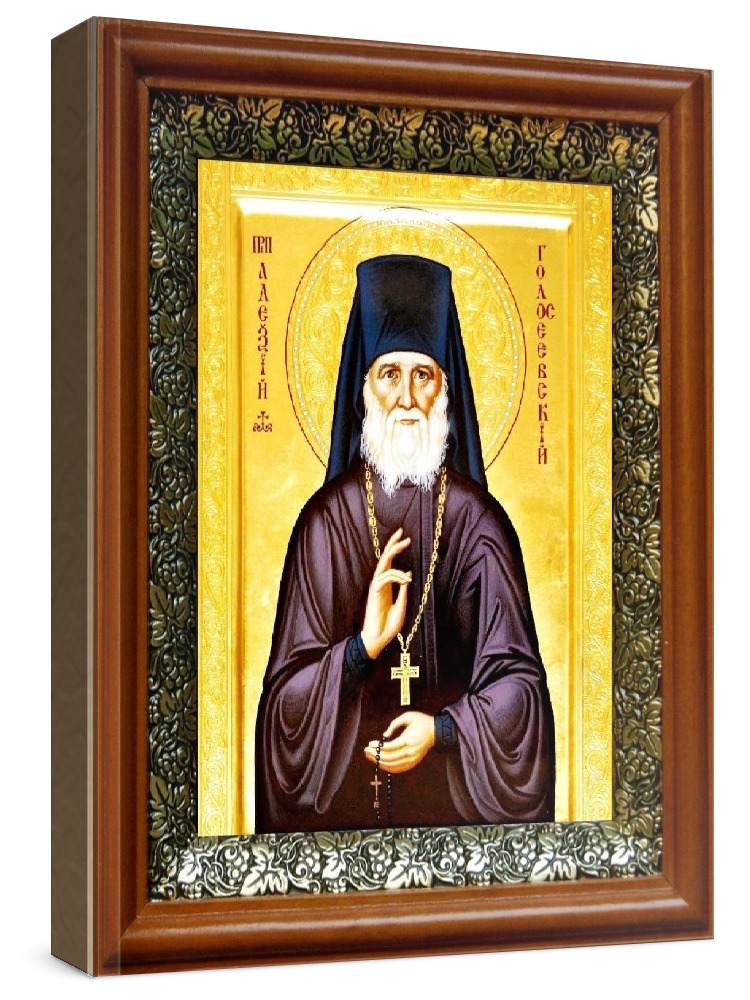 Икона алексий голосеевский (19х22), светлый киот. Лик нанесен методом шелкографии на цельную липовую доску, покрытую левкасом (специальным грунтом под живопись). Использованы минеральные (природные) краски. Размер иконы без киота (см): 13х16, с киотом: 19х22. Киот со стеклом, выполнен из березы и украшен басмой (узор из черненой меди в виде виноградной лозы). Икона освящена.