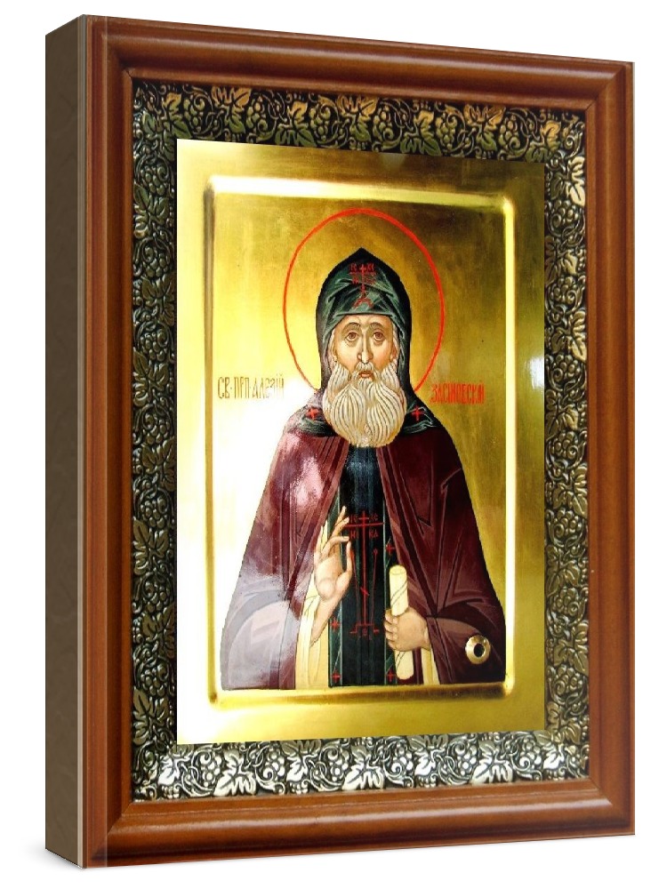 Икона алексий зосимовский (19х22), светлый киот. Лик нанесен методом шелкографии на цельную липовую доску, покрытую левкасом (специальным грунтом под живопись). Использованы минеральные (природные) краски. Размер иконы без киота (см): 13х16, с киотом: 19х22. Киот со стеклом, выполнен из березы и украшен басмой (узор из черненой меди в виде виноградной лозы). Икона освящена.