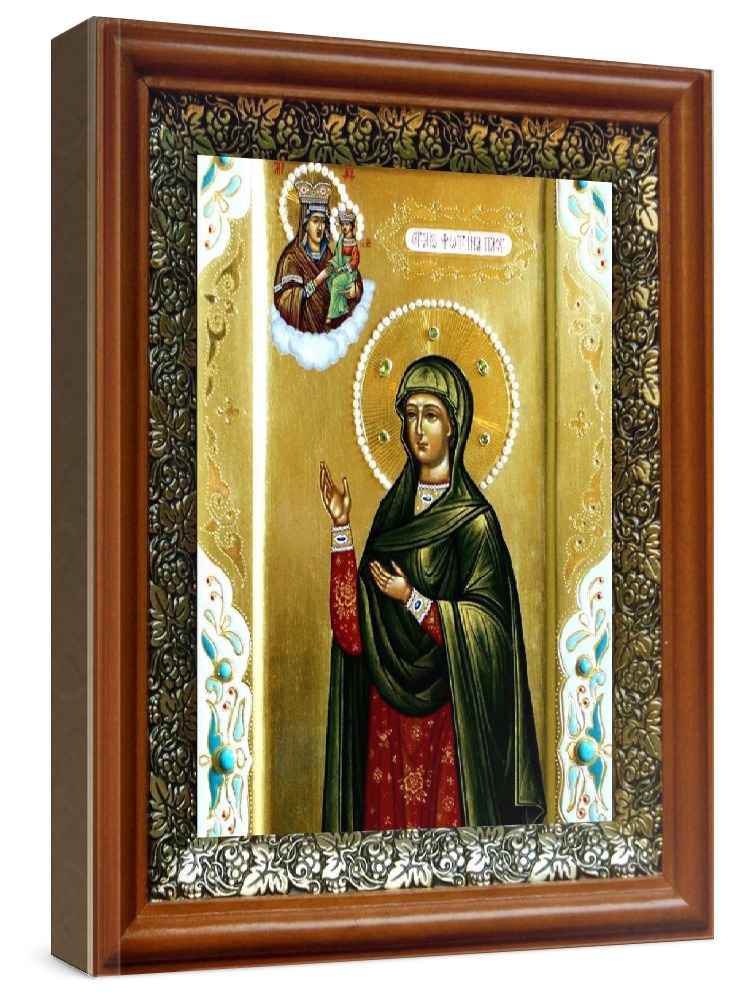 Икона светлана (фотиния) (19х22), светлый киот. Лик нанесен методом шелкографии на цельную липовую доску, покрытую левкасом (специальным грунтом под живопись). Использованы минеральные (природные) краски. Размер иконы без киота (см): 13х16, с киотом: 19х22. Киот со стеклом, выполнен из березы и украшен басмой (узор из черненой меди в виде виноградной лозы). Икона освящена.