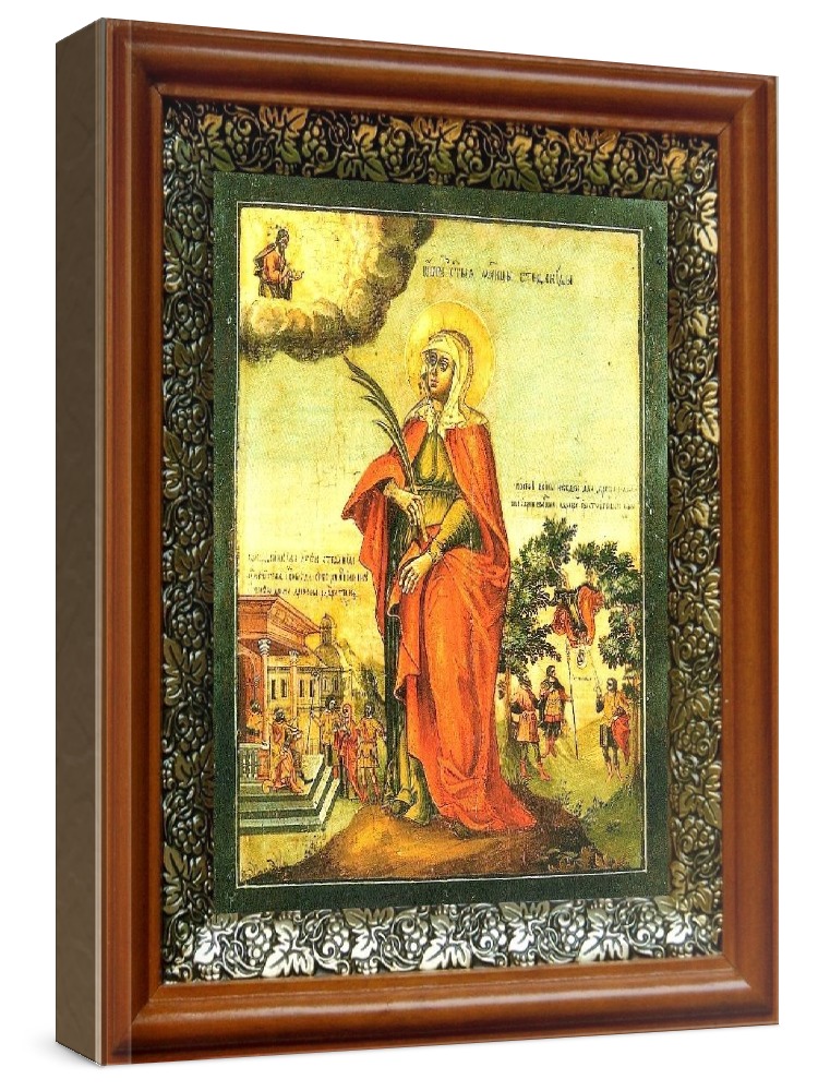 Икона стефанида дамасская (19х22), светлый киот. Лик нанесен методом шелкографии на цельную липовую доску, покрытую левкасом (специальным грунтом под живопись). Использованы минеральные (природные) краски. Размер иконы без киота (см): 13х16, с киотом: 19х22. Киот со стеклом, выполнен из березы и украшен басмой (узор из черненой меди в виде виноградной лозы). Икона освящена.