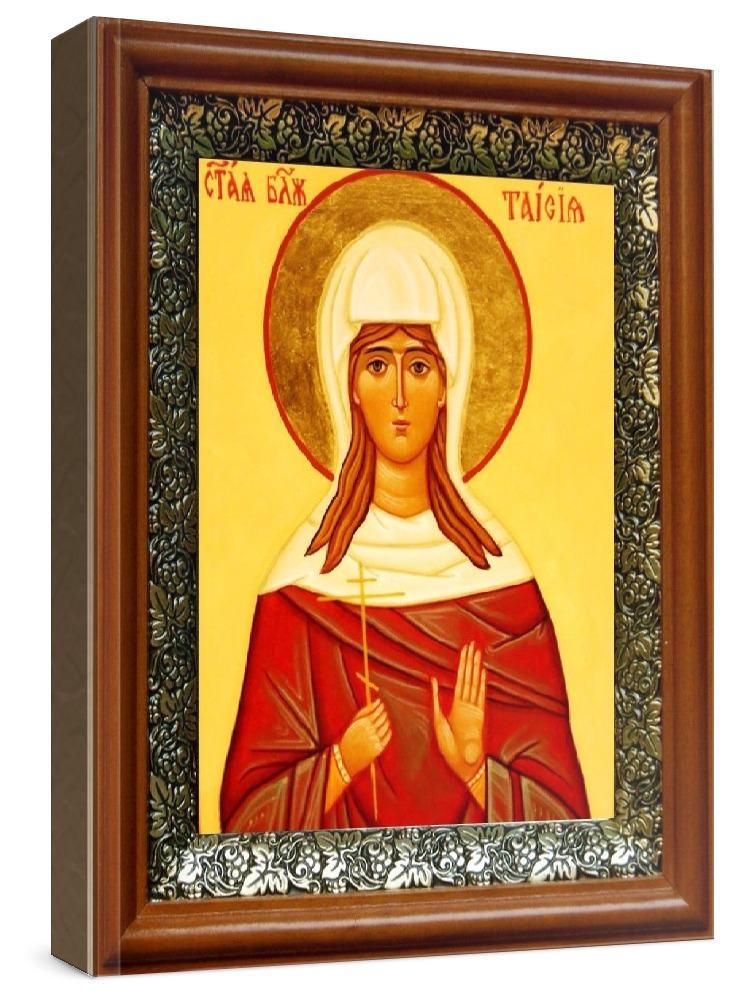 Икона таисия египетская (19х22), светлый киот. Лик нанесен методом шелкографии на цельную липовую доску, покрытую левкасом (специальным грунтом под живопись). Использованы минеральные (природные) краски. Размер иконы без киота (см): 13х16, с киотом: 19х22. Киот со стеклом, выполнен из березы и украшен басмой (узор из черненой меди в виде виноградной лозы). Икона освящена.