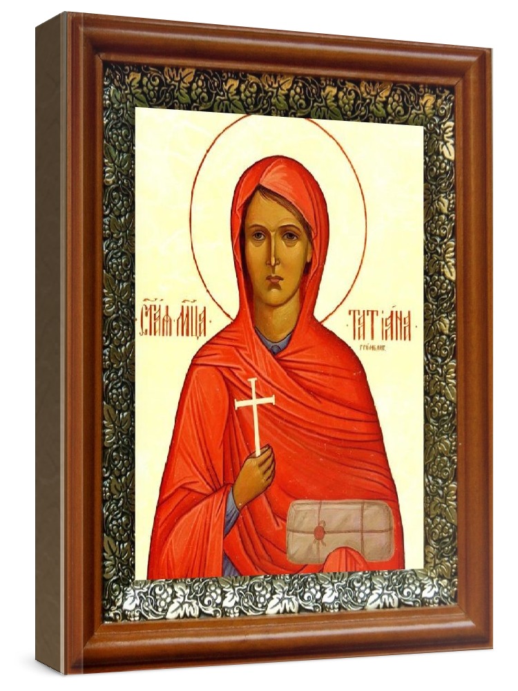 Икона татьяна гримблит (19х22), светлый киот. Лик нанесен методом шелкографии на цельную липовую доску, покрытую левкасом (специальным грунтом под живопись). Использованы минеральные (природные) краски. Размер иконы без киота (см): 13х16, с киотом: 19х22. Киот со стеклом, выполнен из березы и украшен басмой (узор из черненой меди в виде виноградной лозы). Икона освящена.