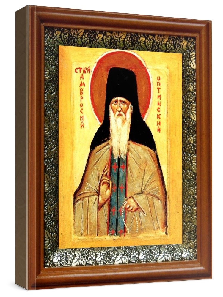 Икона амвросий оптинский (19х22), светлый киот. Лик нанесен методом шелкографии на цельную липовую доску, покрытую левкасом (специальным грунтом под живопись). Использованы минеральные (природные) краски. Размер иконы без киота (см): 13х16, с киотом: 19х22. Киот со стеклом, выполнен из березы и украшен басмой (узор из черненой меди в виде виноградной лозы). Икона освящена.