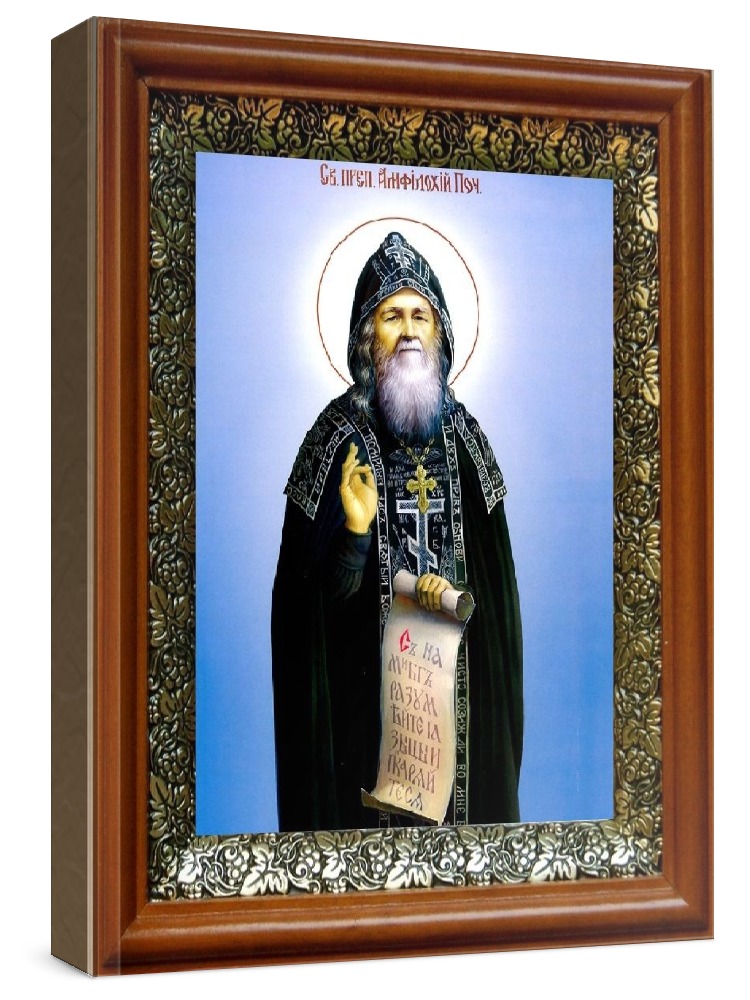 Икона амфилохий почаевский (19х22), светлый киот. Лик нанесен методом шелкографии на цельную липовую доску, покрытую левкасом (специальным грунтом под живопись). Использованы минеральные (природные) краски. Размер иконы без киота (см): 13х16, с киотом: 19х22. Киот со стеклом, выполнен из березы и украшен басмой (узор из черненой меди в виде виноградной лозы). Икона освящена.