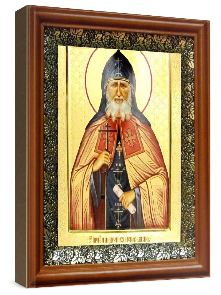 Икона андроник глинский (19х22), светлый киот. Лик нанесен методом шелкографии на цельную липовую доску, покрытую левкасом (специальным грунтом под живопись). Использованы минеральные (природные) краски. Размер иконы без киота (см): 13х16, с киотом: 19х22. Киот со стеклом, выполнен из березы и украшен басмой (узор из черненой меди в виде виноградной лозы). Икона освящена.
