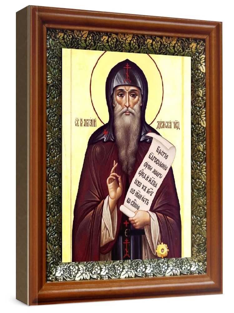 Икона антоний дымский (19х22), светлый киот. Лик нанесен методом шелкографии на цельную липовую доску, покрытую левкасом (специальным грунтом под живопись). Использованы минеральные (природные) краски. Размер иконы без киота (см): 13х16, с киотом: 19х22. Киот со стеклом, выполнен из березы и украшен басмой (узор из черненой меди в виде виноградной лозы). Икона освящена.