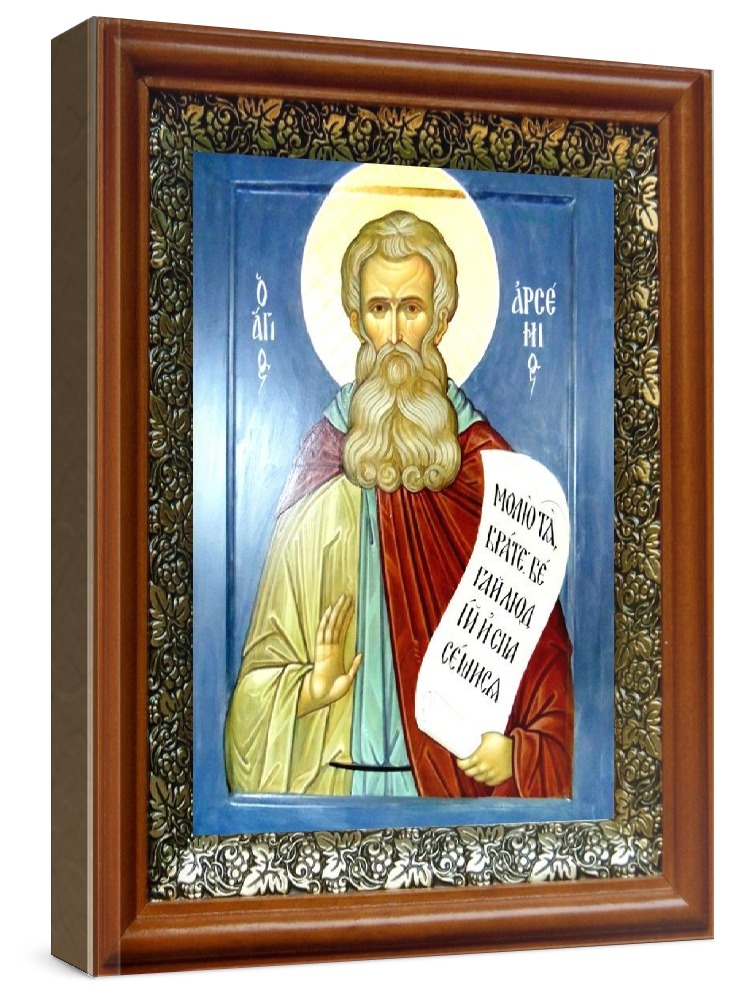 Икона арсений великий (19х22), светлый киот. Лик нанесен методом шелкографии на цельную липовую доску, покрытую левкасом (специальным грунтом под живопись). Использованы минеральные (природные) краски. Размер иконы без киота (см): 13х16, с киотом: 19х22. Киот со стеклом, выполнен из березы и украшен басмой (узор из черненой меди в виде виноградной лозы). Икона освящена.