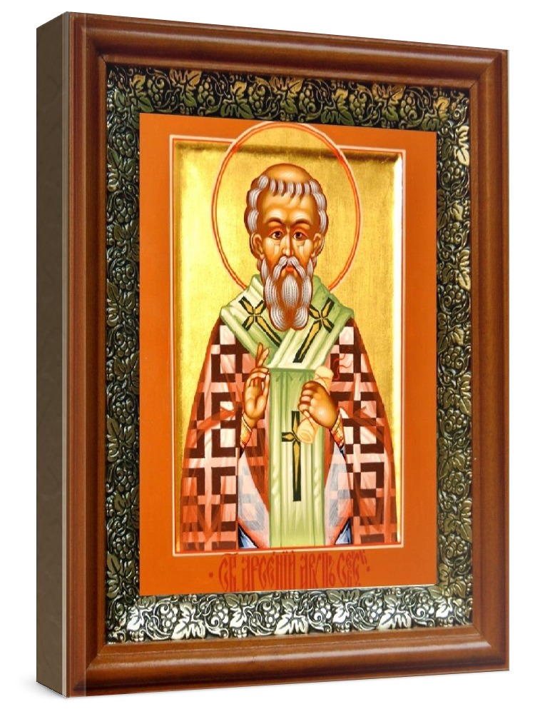 Икона арсений ростовский (19х22), светлый киот. Лик нанесен методом шелкографии на цельную липовую доску, покрытую левкасом (специальным грунтом под живопись). Использованы минеральные (природные) краски. Размер иконы без киота (см): 13х16, с киотом: 19х22. Киот со стеклом, выполнен из березы и украшен басмой (узор из черненой меди в виде виноградной лозы). Икона освящена.