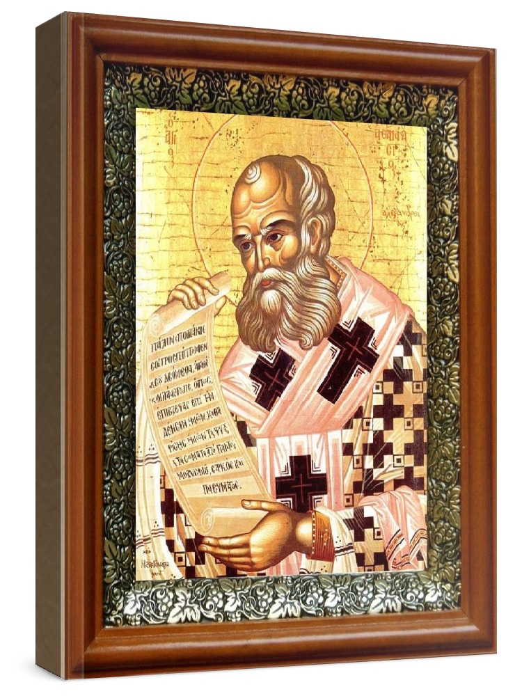 Икона афанасий великий (19х22), светлый киот. Лик нанесен методом шелкографии на цельную липовую доску, покрытую левкасом (специальным грунтом под живопись). Использованы минеральные (природные) краски. Размер иконы без киота (см): 13х16, с киотом: 19х22. Киот со стеклом, выполнен из березы и украшен басмой (узор из черненой меди в виде виноградной лозы). Икона освящена.
