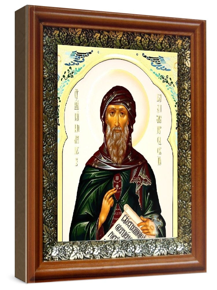 Икона вадим персидский (19х22), светлый киот. Лик нанесен методом шелкографии на цельную липовую доску, покрытую левкасом (специальным грунтом под живопись). Использованы минеральные (природные) краски. Размер иконы без киота (см): 13х16, с киотом: 19х22. Киот со стеклом, выполнен из березы и украшен басмой (узор из черненой меди в виде виноградной лозы). Икона освящена.