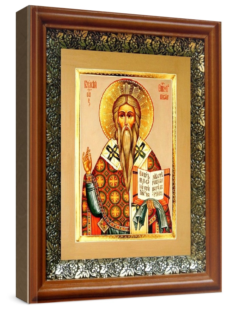 Икона власий севастийский (19х22), светлый киот. Лик нанесен методом шелкографии на цельную липовую доску, покрытую левкасом (специальным грунтом под живопись). Использованы минеральные (природные) краски. Размер иконы без киота (см): 13х16, с киотом: 19х22. Киот со стеклом, выполнен из березы и украшен басмой (узор из черненой меди в виде виноградной лозы). Икона освящена.