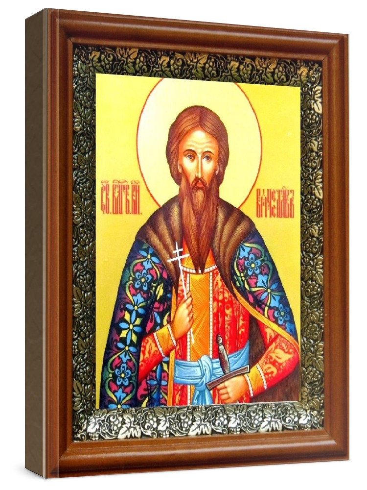 Икона вячеслав чешский (19х22), светлый киот. Лик нанесен методом шелкографии на цельную липовую доску, покрытую левкасом (специальным грунтом под живопись). Использованы минеральные (природные) краски. Размер иконы без киота (см): 13х16, с киотом: 19х22. Киот со стеклом, выполнен из березы и украшен басмой (узор из черненой меди в виде виноградной лозы). Икона освящена.