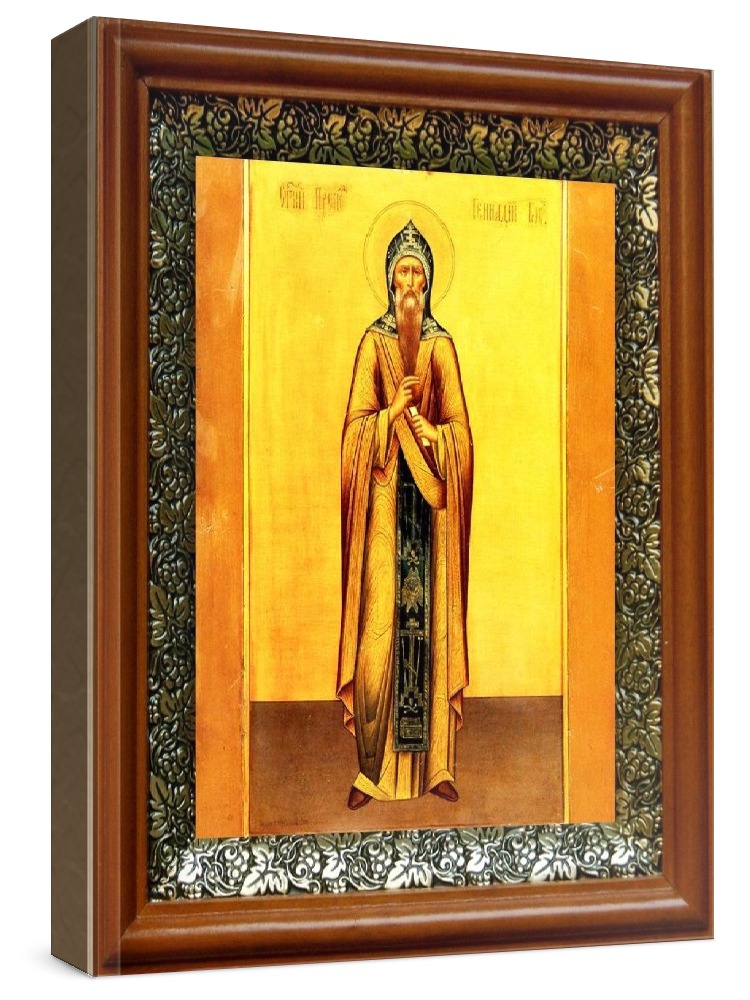 Икона геннадий костромской (19х22), светлый киот. Лик нанесен методом шелкографии на цельную липовую доску, покрытую левкасом (специальным грунтом под живопись). Использованы минеральные (природные) краски. Размер иконы без киота (см): 13х16, с киотом: 19х22. Киот со стеклом, выполнен из березы и украшен басмой (узор из черненой меди в виде виноградной лозы). Икона освящена.