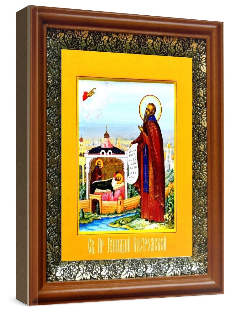 Икона геннадий костромской (19х22), светлый киот. Лик нанесен методом шелкографии на цельную липовую доску, покрытую левкасом (специальным грунтом под живопись). Использованы минеральные (природные) краски. Размер иконы без киота (см): 13х16, с киотом: 19х22. Киот со стеклом, выполнен из березы и украшен басмой (узор из черненой меди в виде виноградной лозы). Икона освящена.