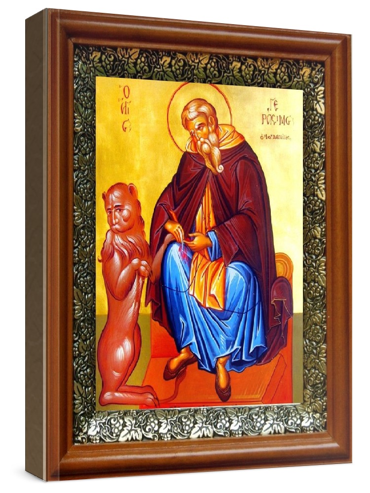 Икона герасим иорданский (19х22), светлый киот. Лик нанесен методом шелкографии на цельную липовую доску, покрытую левкасом (специальным грунтом под живопись). Использованы минеральные (природные) краски. Размер иконы без киота (см): 13х16, с киотом: 19х22. Киот со стеклом, выполнен из березы и украшен басмой (узор из черненой меди в виде виноградной лозы). Икона освящена.