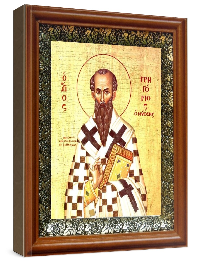 Икона григорий нисский (19х22), светлый киот. Лик нанесен методом шелкографии на цельную липовую доску, покрытую левкасом (специальным грунтом под живопись). Использованы минеральные (природные) краски. Размер иконы без киота (см): 13х16, с киотом: 19х22. Киот со стеклом, выполнен из березы и украшен басмой (узор из черненой меди в виде виноградной лозы). Икона освящена.
