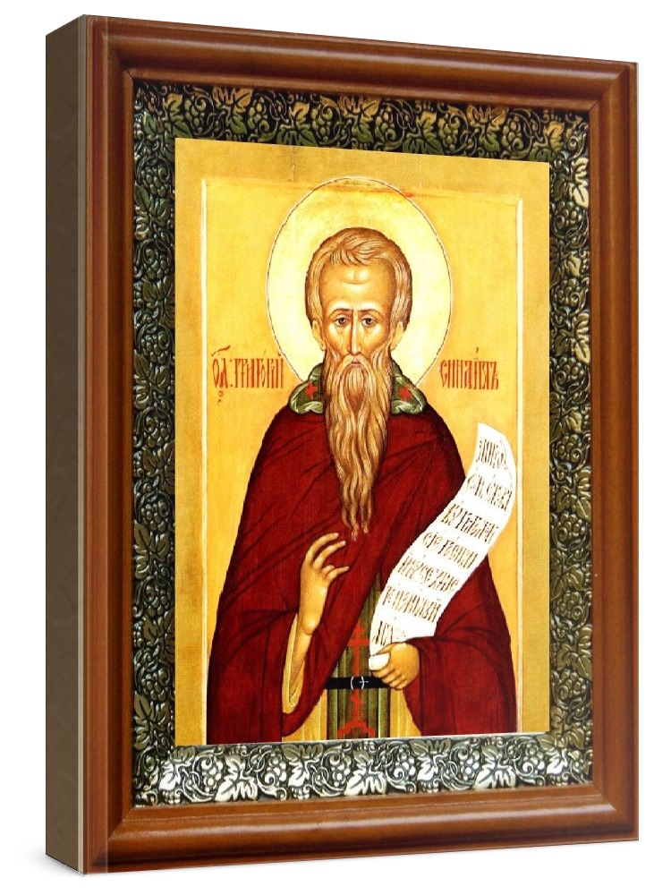 Икона григорий синаит (19х22), светлый киот.     Лик нанесен методом шелкографии на цельную липовую доску, покрытую левкасом (специальным грунтом под живопись). Использованы минеральные (природные) краски.  Размер иконы без киота (см): 13х16, с киотом: 19х22.  Киот со стеклом, выполнен из березы и украшен басмой (узор из черненой меди в виде виноградной лозы).  Икона освящена.