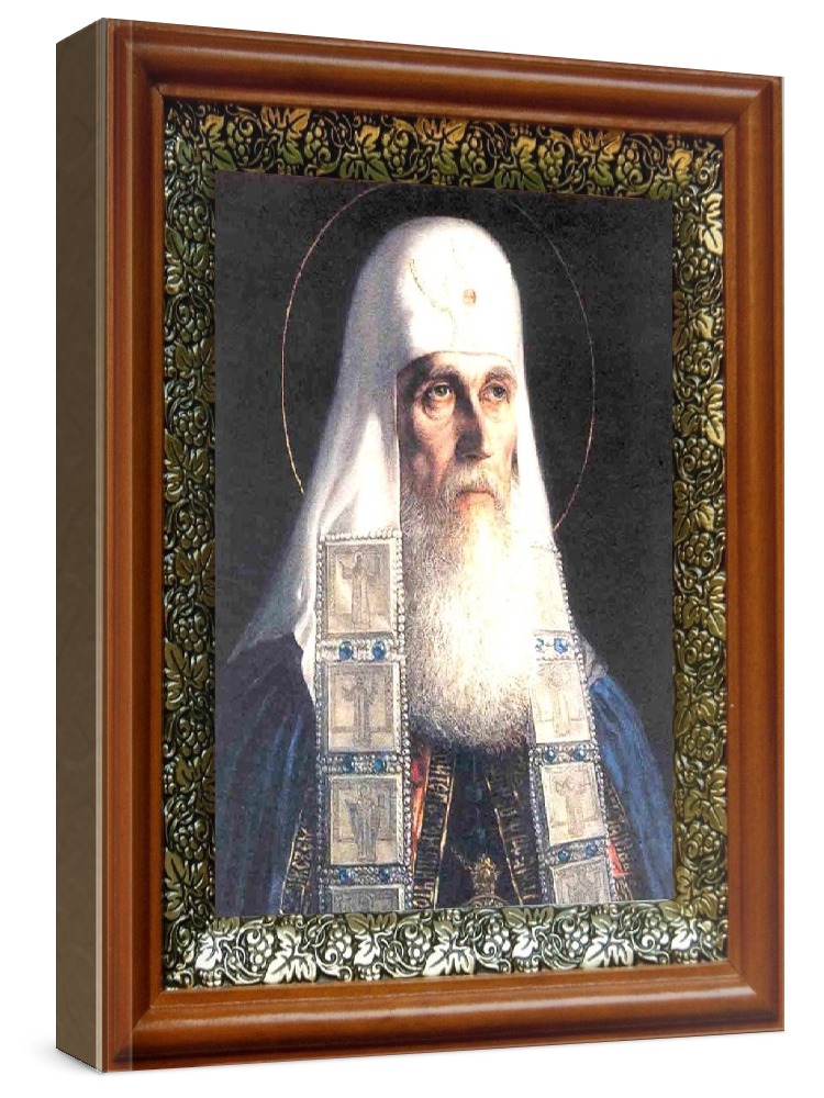 Икона ермоген, патриарх московский (19х22), светлый киот. Лик нанесен методом шелкографии на цельную липовую доску, покрытую левкасом (специальным грунтом под живопись). Использованы минеральные (природные) краски. Размер иконы без киота (см): 13х16, с киотом: 19х22. Киот со стеклом, выполнен из березы и украшен басмой (узор из черненой меди в виде виноградной лозы). Икона освящена.