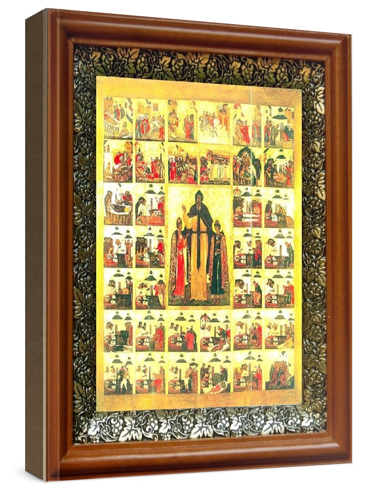 Икона давид ярославский (19х22), светлый киот. Лик нанесен методом шелкографии на цельную липовую доску, покрытую левкасом (специальным грунтом под живопись). Использованы минеральные (природные) краски. Размер иконы без киота (см): 13х16, с киотом: 19х22. Киот со стеклом, выполнен из березы и украшен басмой (узор из черненой меди в виде виноградной лозы). Икона освящена.