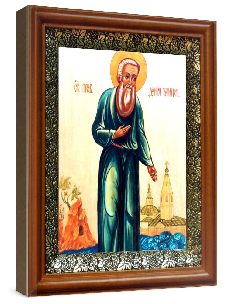 Икона даниил ачинский (19х22), светлый киот. Лик нанесен методом шелкографии на цельную липовую доску, покрытую левкасом (специальным грунтом под живопись). Использованы минеральные (природные) краски. Размер иконы без киота (см): 13х16, с киотом: 19х22. Киот со стеклом, выполнен из березы и украшен басмой (узор из черненой меди в виде виноградной лозы). Икона освящена.