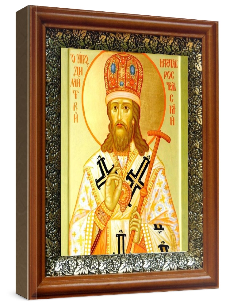 Икона димитрий ростовский (19х22), светлый киот. Лик нанесен методом шелкографии на цельную липовую доску, покрытую левкасом (специальным грунтом под живопись). Использованы минеральные (природные) краски. Размер иконы без киота (см): 13х16, с киотом: 19х22. Киот со стеклом, выполнен из березы и украшен басмой (узор из черненой меди в виде виноградной лозы). Икона освящена.