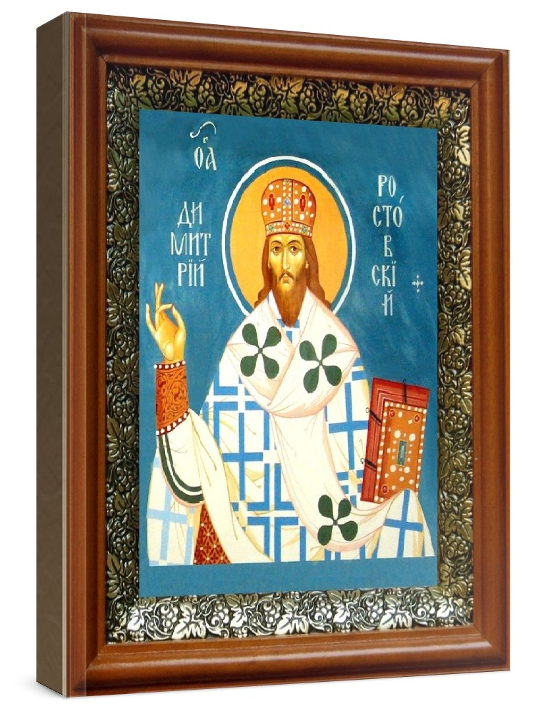 Икона димитрий ростовский (19х22), светлый киот. Лик нанесен методом шелкографии на цельную липовую доску, покрытую левкасом (специальным грунтом под живопись). Использованы минеральные (природные) краски. Размер иконы без киота (см): 13х16, с киотом: 19х22. Киот со стеклом, выполнен из березы и украшен басмой (узор из черненой меди в виде виноградной лозы). Икона освящена.