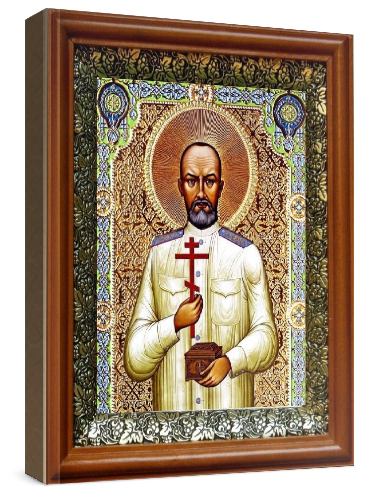 Икона евгений боткин (19х22), светлый киот. Лик нанесен методом шелкографии на цельную липовую доску, покрытую левкасом (специальным грунтом под живопись). Использованы минеральные (природные) краски. Размер иконы без киота (см): 13х16, с киотом: 19х22. Киот со стеклом, выполнен из березы и украшен басмой (узор из черненой меди в виде виноградной лозы). Икона освящена.