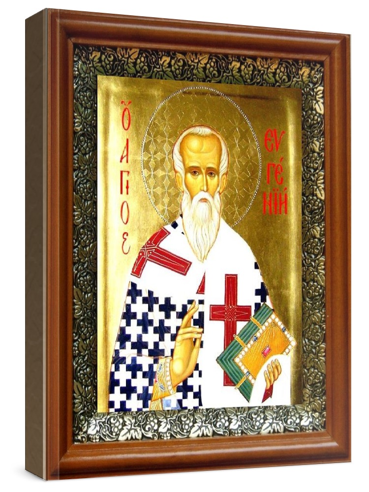 Икона евгений херсонский (19х22), светлый киот. Лик нанесен методом шелкографии на цельную липовую доску, покрытую левкасом (специальным грунтом под живопись). Использованы минеральные (природные) краски. Размер иконы без киота (см): 13х16, с киотом: 19х22. Киот со стеклом, выполнен из березы и украшен басмой (узор из черненой меди в виде виноградной лозы). Икона освящена.