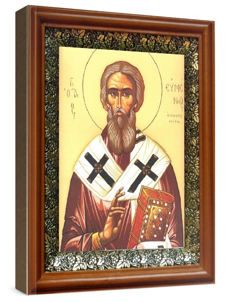 Икона евмений гортинский (19х22), светлый киот. Лик нанесен методом шелкографии на цельную липовую доску, покрытую левкасом (специальным грунтом под живопись). Использованы минеральные (природные) краски. Размер иконы без киота (см): 13х16, с киотом: 19х22. Киот со стеклом, выполнен из березы и украшен басмой (узор из черненой меди в виде виноградной лозы). Икона освящена.