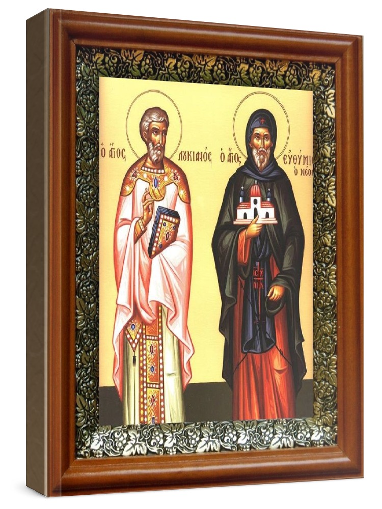 Икона евфимий новый (19х22), светлый киот. Лик нанесен методом шелкографии на цельную липовую доску, покрытую левкасом (специальным грунтом под живопись). Использованы минеральные (природные) краски. Размер иконы без киота (см): 13х16, с киотом: 19х22. Киот со стеклом, выполнен из березы и украшен басмой (узор из черненой меди в виде виноградной лозы). Икона освящена.