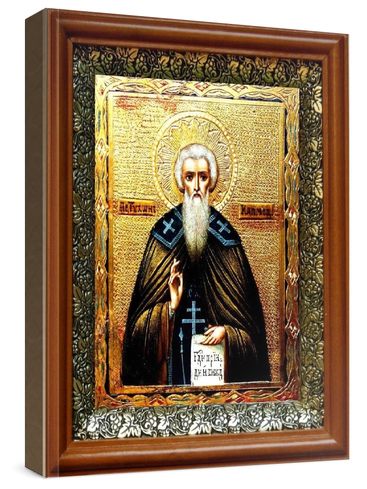 Икона тихон калужский (19х22), светлый киот. Лик нанесен методом шелкографии на цельную липовую доску, покрытую левкасом (специальным грунтом под живопись). Использованы минеральные (природные) краски. Размер иконы без киота (см): 13х16, с киотом: 19х22. Киот со стеклом, выполнен из березы и украшен басмой (узор из черненой меди в виде виноградной лозы). Икона освящена.