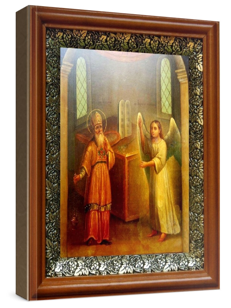 Икона захария, пророк (19х22), светлый киот. Лик нанесен методом шелкографии на цельную липовую доску, покрытую левкасом (специальным грунтом под живопись). Использованы минеральные (природные) краски. Размер иконы без киота (см): 13х16, с киотом: 19х22. Киот со стеклом, выполнен из березы и украшен басмой (узор из черненой меди в виде виноградной лозы). Икона освящена.
