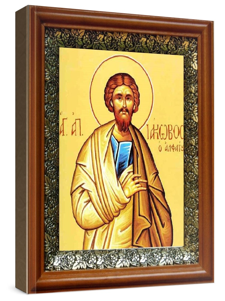 Икона иаков алфеев (19х22), светлый киот. Лик нанесен методом шелкографии на цельную липовую доску, покрытую левкасом (специальным грунтом под живопись). Использованы минеральные (природные) краски. Размер иконы без киота (см): 13х16, с киотом: 19х22. Киот со стеклом, выполнен из березы и украшен басмой (узор из черненой меди в виде виноградной лозы). Икона освящена.