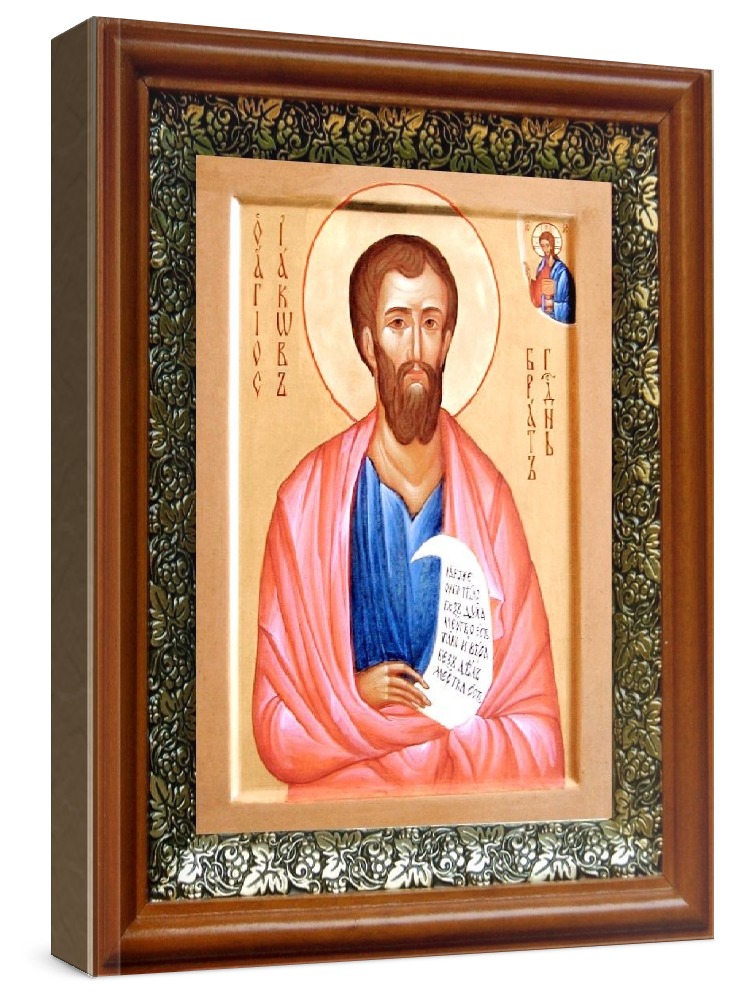 Икона иаков, брат господень (19х22), светлый киот. Лик нанесен методом шелкографии на цельную липовую доску, покрытую левкасом (специальным грунтом под живопись). Использованы минеральные (природные) краски. Размер иконы без киота (см): 13х16, с киотом: 19х22. Киот со стеклом, выполнен из березы и украшен басмой (узор из черненой меди в виде виноградной лозы). Икона освящена.