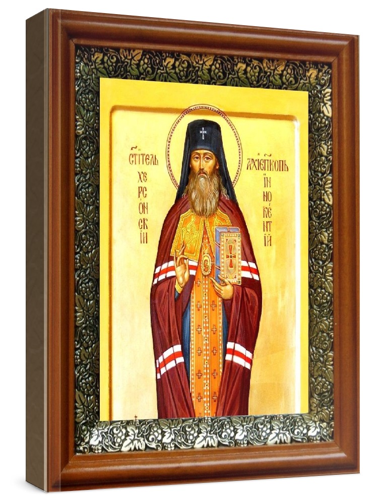 Икона иннокентий херсонский (19х22), светлый киот. Лик нанесен методом шелкографии на цельную липовую доску, покрытую левкасом (специальным грунтом под живопись). Использованы минеральные (природные) краски. Размер иконы без киота (см): 13х16, с киотом: 19х22. Киот со стеклом, выполнен из березы и украшен басмой (узор из черненой меди в виде виноградной лозы). Икона освящена.