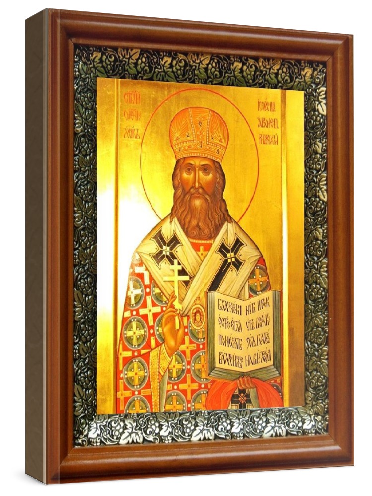 Икона иоанн рижский (19х22), светлый киот. Лик нанесен методом шелкографии на цельную липовую доску, покрытую левкасом (специальным грунтом под живопись). Использованы минеральные (природные) краски. Размер иконы без киота (см): 13х16, с киотом: 19х22. Киот со стеклом, выполнен из березы и украшен басмой (узор из черненой меди в виде виноградной лозы). Икона освящена.