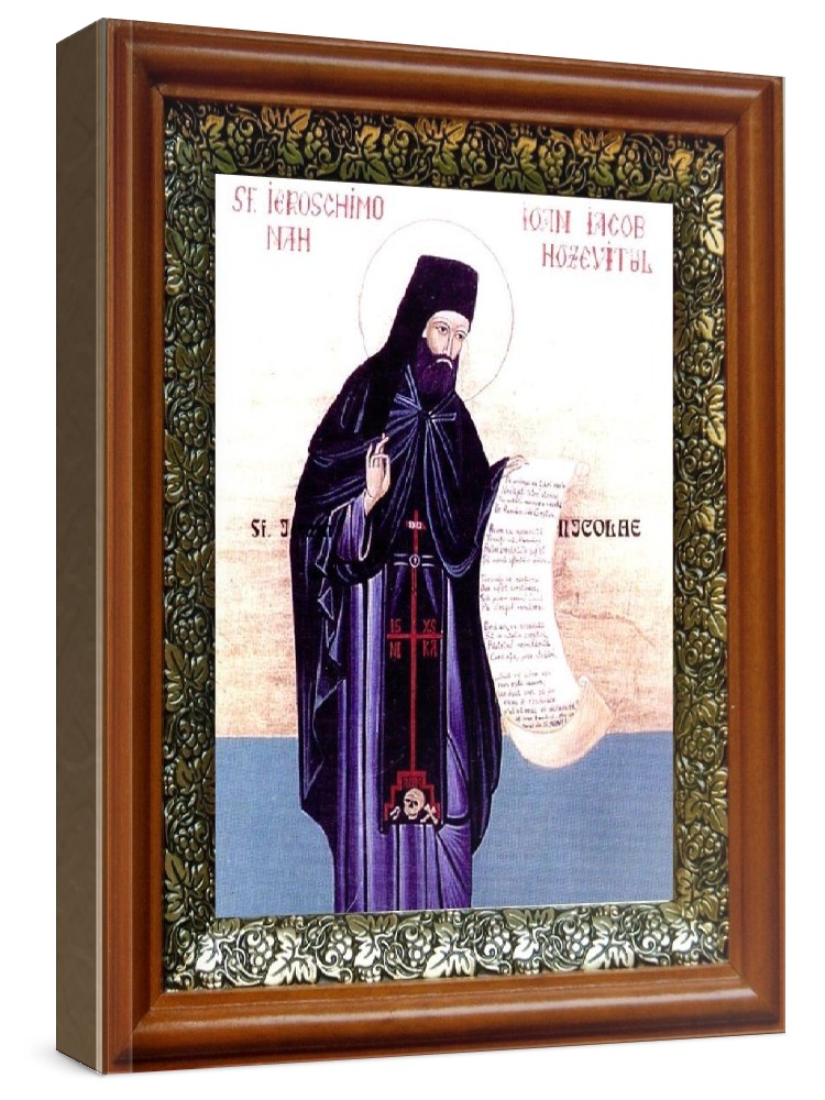 Икона иоанн хозевит (19х22), светлый киот. Лик нанесен методом шелкографии на цельную липовую доску, покрытую левкасом (специальным грунтом под живопись). Использованы минеральные (природные) краски. Размер иконы без киота (см): 13х16, с киотом: 19х22. Киот со стеклом, выполнен из березы и украшен басмой (узор из черненой меди в виде виноградной лозы). Икона освящена.