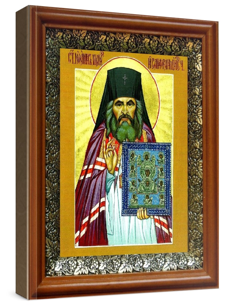 Икона иоанн шанхайский (19х22), светлый киот. Лик нанесен методом шелкографии на цельную липовую доску, покрытую левкасом (специальным грунтом под живопись). Использованы минеральные (природные) краски. Размер иконы без киота (см): 13х16, с киотом: 19х22. Киот со стеклом, выполнен из березы и украшен басмой (узор из черненой меди в виде виноградной лозы). Икона освящена.