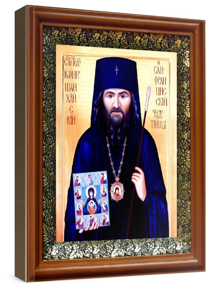 Икона иоанн шанхайский (19х22), светлый киот. Лик нанесен методом шелкографии на цельную липовую доску, покрытую левкасом (специальным грунтом под живопись). Использованы минеральные (природные) краски. Размер иконы без киота (см): 13х16, с киотом: 19х22. Киот со стеклом, выполнен из березы и украшен басмой (узор из черненой меди в виде виноградной лозы). Икона освящена.