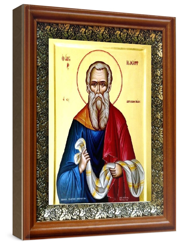 Икона иосиф аримафейский (19х22), светлый киот. Лик нанесен методом шелкографии на цельную липовую доску, покрытую левкасом (специальным грунтом под живопись). Использованы минеральные (природные) краски. Размер иконы без киота (см): 13х16, с киотом: 19х22. Киот со стеклом, выполнен из березы и украшен басмой (узор из черненой меди в виде виноградной лозы). Икона освящена.