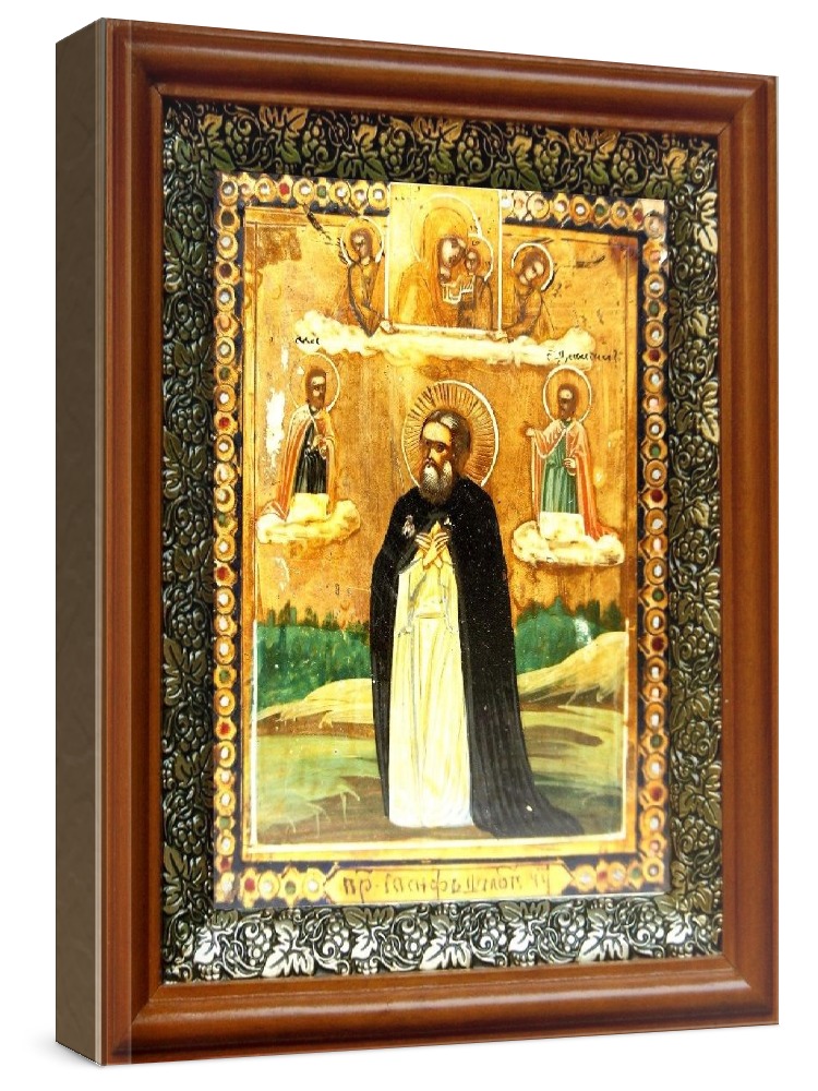 Икона иосиф вологодский (19х22), светлый киот. Лик нанесен методом шелкографии на цельную липовую доску, покрытую левкасом (специальным грунтом под живопись). Использованы минеральные (природные) краски. Размер иконы без киота (см): 13х16, с киотом: 19х22. Киот со стеклом, выполнен из березы и украшен басмой (узор из черненой меди в виде виноградной лозы). Икона освящена.