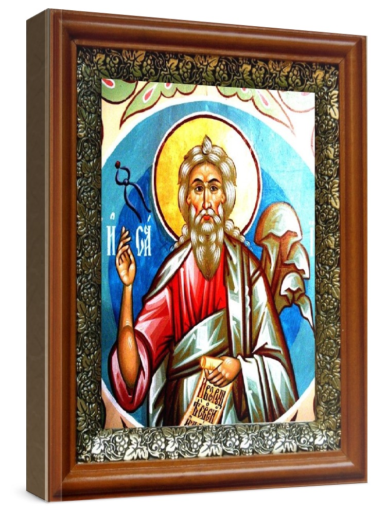 Икона пророк исаия (19х22), светлый киот. Лик нанесен методом шелкографии на цельную липовую доску, покрытую левкасом (специальным грунтом под живопись). Использованы минеральные (природные) краски. Размер иконы без киота (см): 13х16, с киотом: 19х22. Киот со стеклом, выполнен из березы и украшен басмой (узор из черненой меди в виде виноградной лозы). Икона освящена.
