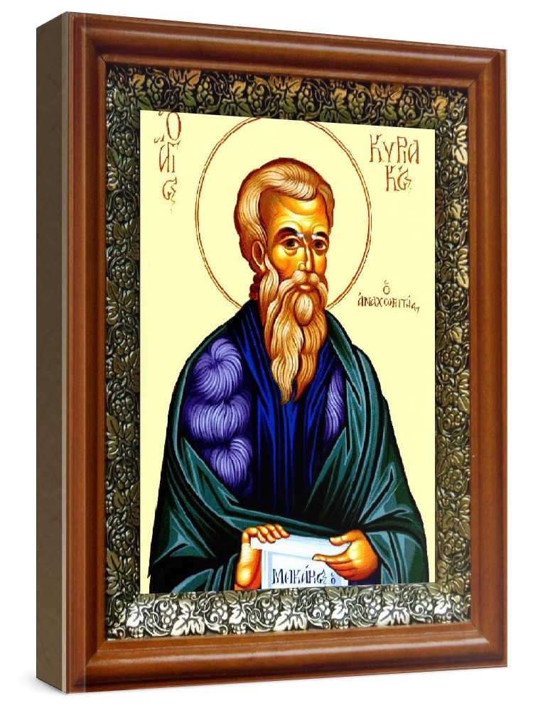 Икона кириак палестинский (19х22), светлый киот. Лик нанесен методом шелкографии на цельную липовую доску, покрытую левкасом (специальным грунтом под живопись). Использованы минеральные (природные) краски. Размер иконы без киота (см): 13х16, с киотом: 19х22. Киот со стеклом, выполнен из березы и украшен басмой (узор из черненой меди в виде виноградной лозы). Икона освящена.