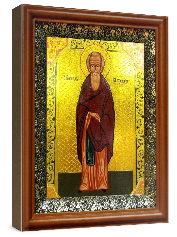 Икона кирилл белозерский (19х22), светлый киот. Лик нанесен методом шелкографии на цельную липовую доску, покрытую левкасом (специальным грунтом под живопись). Использованы минеральные (природные) краски. Размер иконы без киота (см): 13х16, с киотом: 19х22. Киот со стеклом, выполнен из березы и украшен басмой (узор из черненой меди в виде виноградной лозы). Икона освящена.