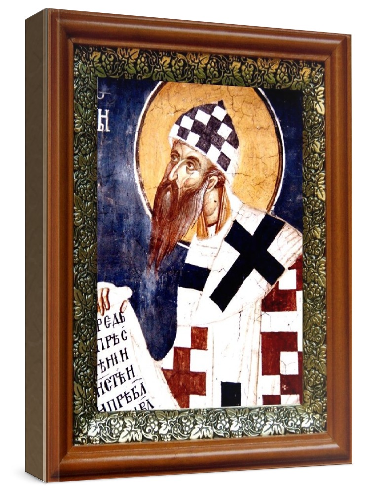 Икона кирилл иерусалимский (19х22), светлый киот. Лик нанесен методом шелкографии на цельную липовую доску, покрытую левкасом (специальным грунтом под живопись). Использованы минеральные (природные) краски. Размер иконы без киота (см): 13х16, с киотом: 19х22. Киот со стеклом, выполнен из березы и украшен басмой (узор из черненой меди в виде виноградной лозы). Икона освящена.