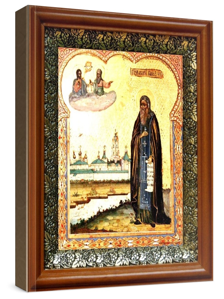 Икона макарий калязинский (19х22), светлый киот. Лик нанесен методом шелкографии на цельную липовую доску, покрытую левкасом (специальным грунтом под живопись). Использованы минеральные (природные) краски. Размер иконы без киота (см): 13х16, с киотом: 19х22. Киот со стеклом, выполнен из березы и украшен басмой (узор из черненой меди в виде виноградной лозы). Икона освящена.