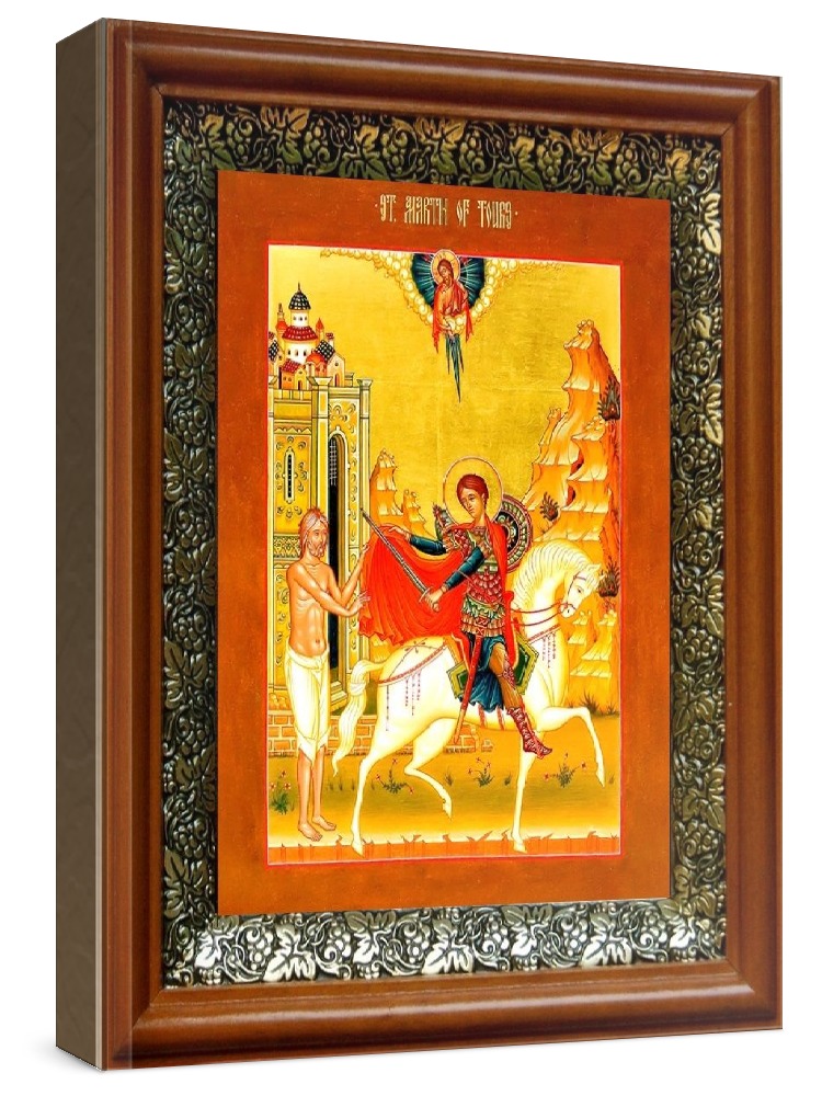 Икона мартин турский (19х22), светлый киот. Лик нанесен методом шелкографии на цельную липовую доску, покрытую левкасом (специальным грунтом под живопись). Использованы минеральные (природные) краски. Размер иконы без киота (см): 13х16, с киотом: 19х22. Киот со стеклом, выполнен из березы и украшен басмой (узор из черненой меди в виде виноградной лозы). Икона освящена.